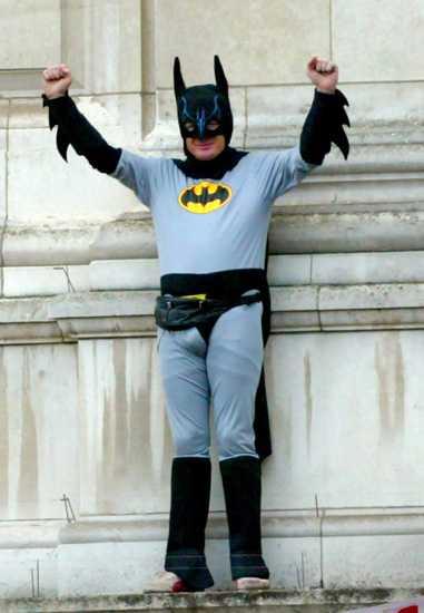 Fathers' rights campaigner Jason Hatch, dressed as Batman, gestures as he protests on a balcony at Buckingham Palace in London. Photo: Reuters