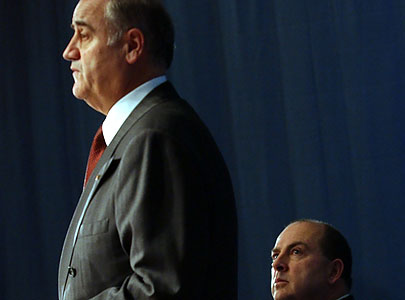 Julian Fantino, left, discusses the police corruption case at a news conference in 2004 during his tenure as police chief. John Neily, now assistant commissioner with the RCMP and head of the probe, looks on.
