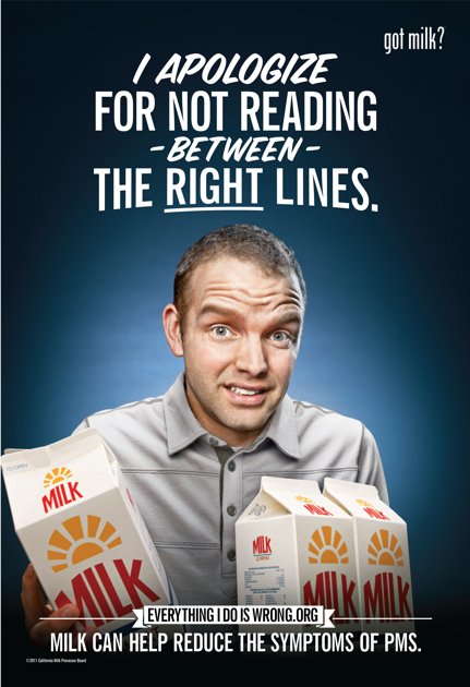 In each poster, confused men holding cartons of milk accompanied by tag lines such as 'I'm sorry I listened to what you said and NOT what you meant,' or 'I apologize for not reading between the RIGHT lines.'